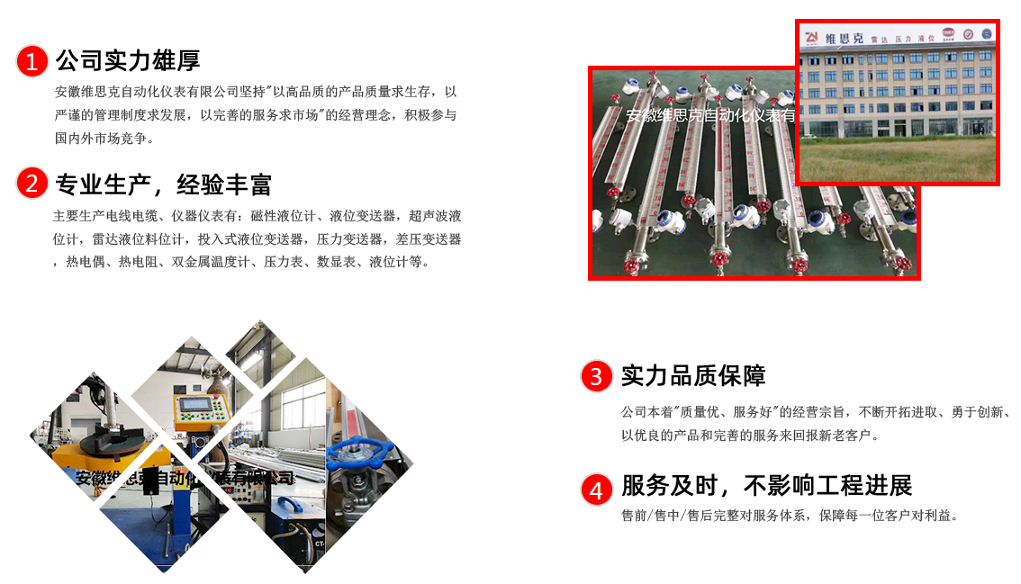 安徽維思克自動化儀表有限公司擁有好的生產設備和檢測設備。主要生產電線電纜、儀器儀表有:磁性液位計、液位變送器,超聲波液位計,雷達液位料位計,投入式液位變送器,壓力變送器,差壓變送器,熱電偶、熱電阻、雙金屬溫度計、壓力表、數顯表、液位計等。廣泛用于冶金、電力、石油、化工、汽車、造紙、煤礦、造船、港口、起重、建材、制藥、交通、國防、城市建設等領域。